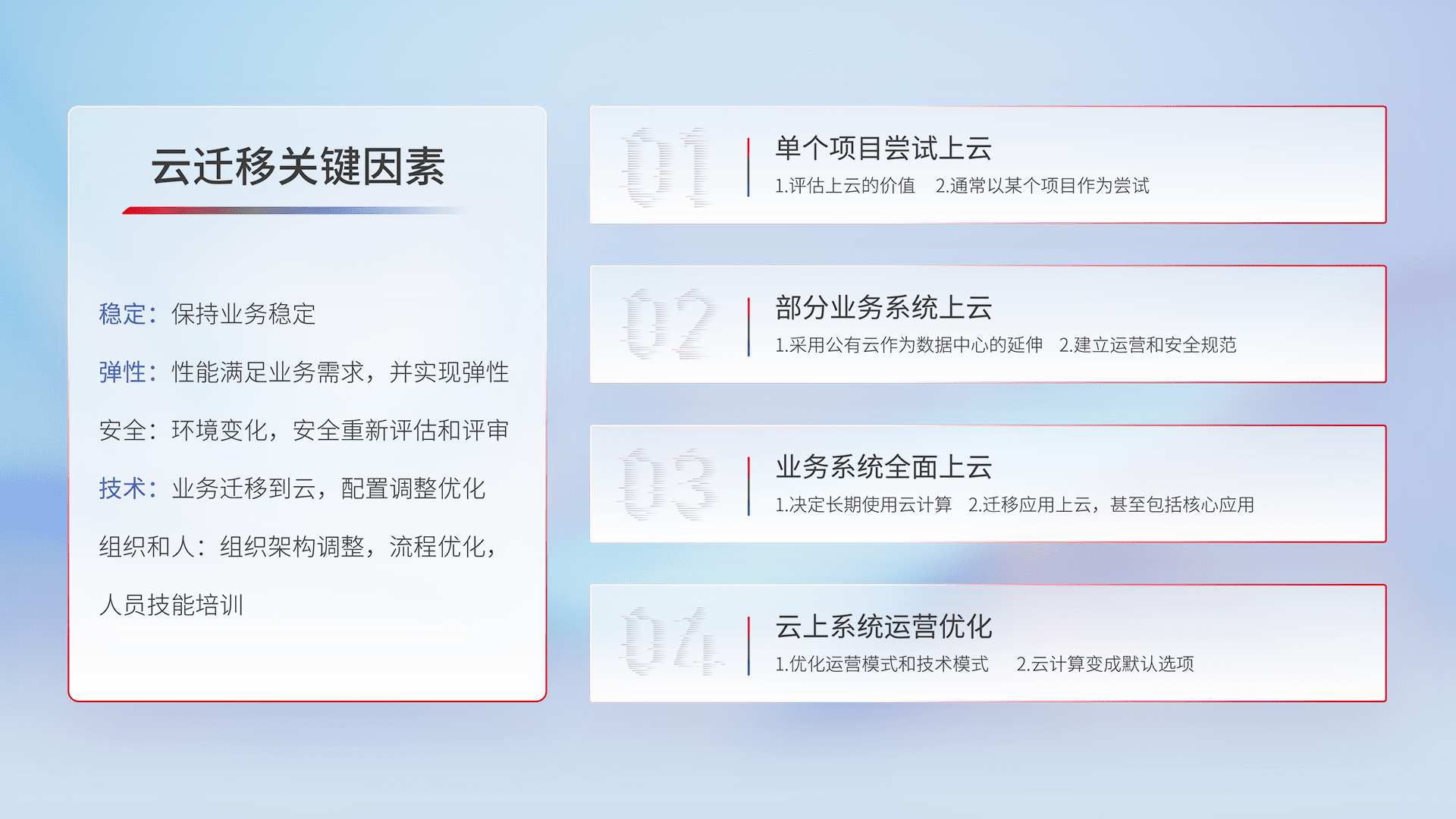 结合实际业务,,从规划设计、、云平台选型、、、、云原生改造、、、数据迁移、、集成交付,,,迁移全过程为客户识别最佳上云路径,,做好风险识别管理,,,设计网络架构、、、身份权限、、、安全审计合规、、、、操作审计、、日志审计、、、监控告警策略、、多站点容灾设计等,,对云上基础设施进行整体规划,,,提升IT治理水平,,以满足弹性、、、高可用、、高性能的需求。。。