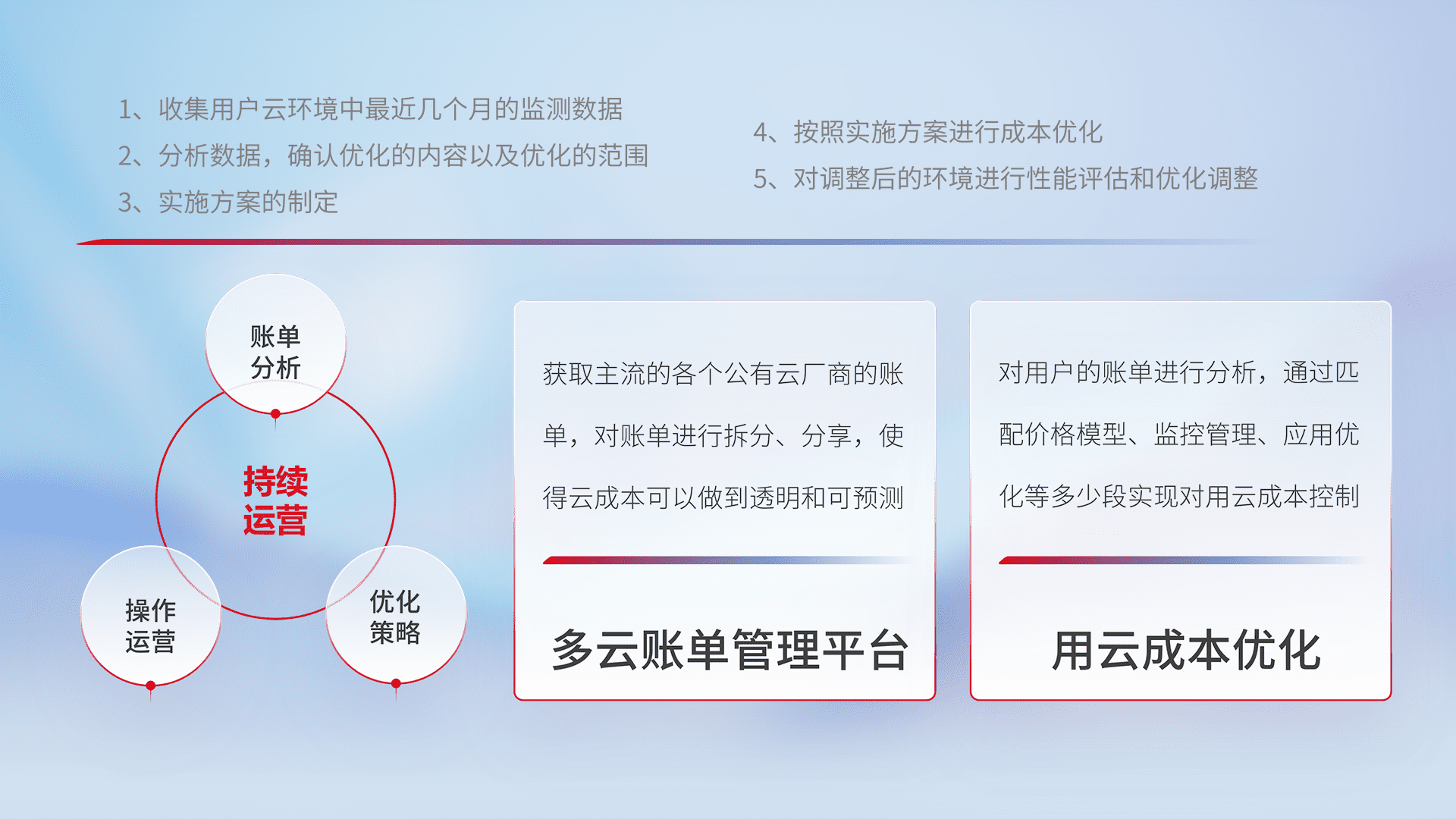通过多云纳管,,,,以统一的资源数据模型把客户的云资源进行抽象和封装,,进而实现对多云资源的统一操作,,,保障云资源管理的可靠性、、、、稳定性与可用性。。量身定制化运维内容,,配置、、开发运维、、补丁管理、、、备份、、监控、、、认证和访问管理、、、审计和日常巡检等,,,,保障在用云过程中的可靠度,,,,稳定度以及高可用率。。。。