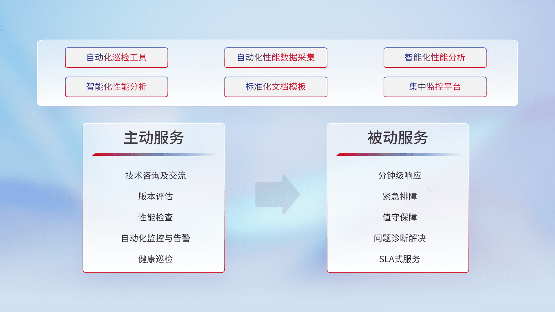 智能化工具和标准化文档,,保障服务质量,,提供主动服务(包含技术咨询、、、、版本评估、、性能检查、、、、自动化监控与告警、、、、健康巡检)和被动服务包含(分钟级响应、、紧急排障、、、、值守保障、、、、问题诊断解决、、、SLA服务)。。