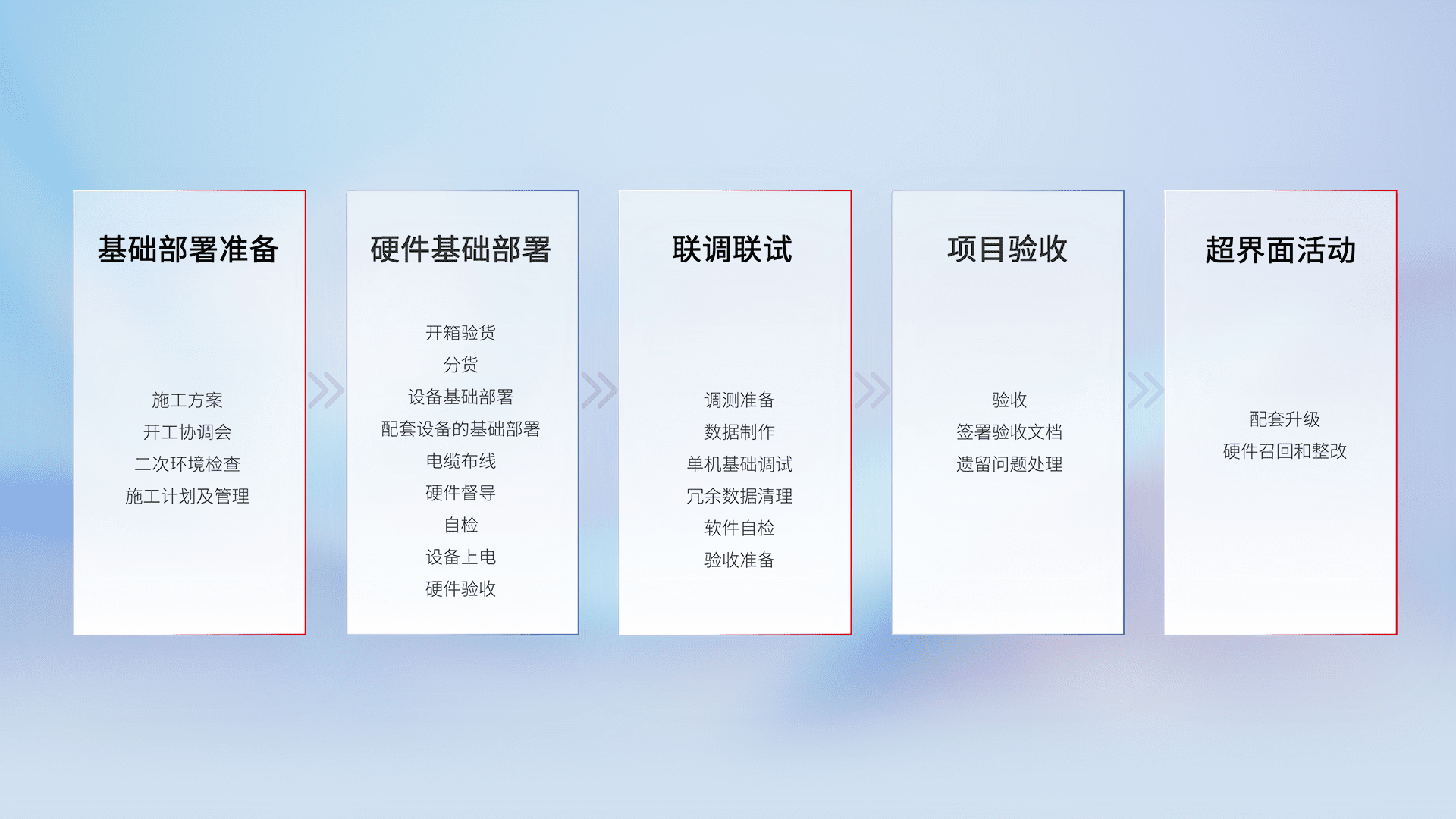 从基础部署准备、、、、硬件基础部署、、、、联调联试、、、、项目验收、、、越界面活动的全过程可追溯,,保证施工质量和进度。。。